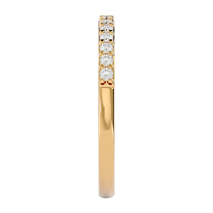 This wedding band contains 24 sparkling moissanites in E-F color, VVS1-VVS2 clarity totaling 1/4 carat. This ring is in 14 karat yellow gold.