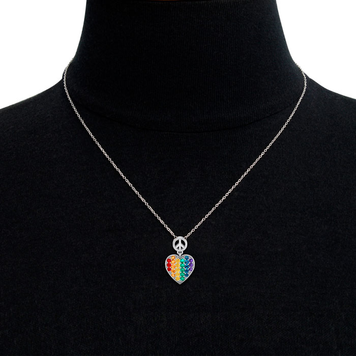 Show your PRIDE with this standout heart necklace! This necklace features various created emerald, created sapphire and created ruby gemstones. Total carat weight is 1/4 carat. This necklace is in 14 karat white gold and has an 18 inch cable chain with a spring ring clasp. The heart is about 1/2 inch and the heart with the peace sign is 3/4 inch long.