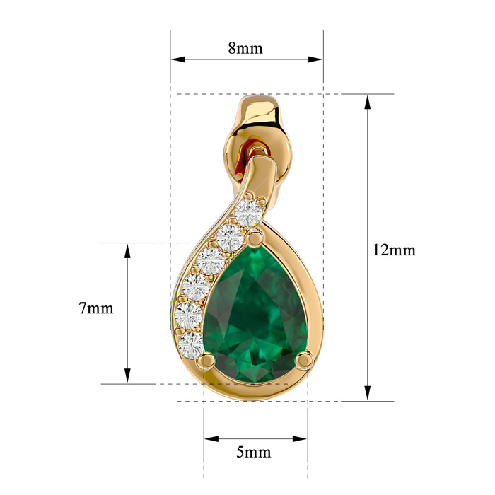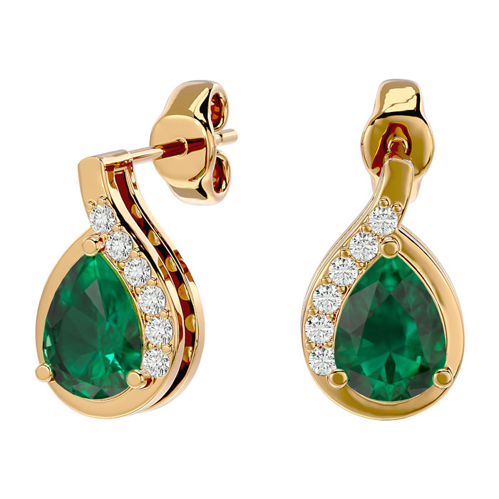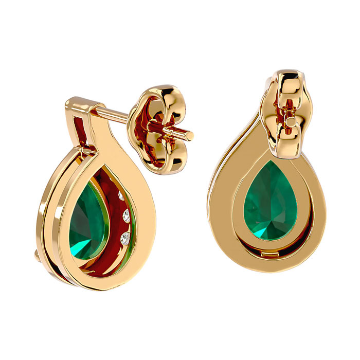 These elegant gemstone earrings feature two 7x5mm pear shape emerald gemstones at approximately 1 1/3 carats. They are surrounded by 12 sparkling diamonds in I-J color, I1-I2 clarity at 1/10 carat total weight. Total gem weight is approximately 1.40 carats. These earrings are in 14 karat yellow gold and have comfortable and secure friction backs.