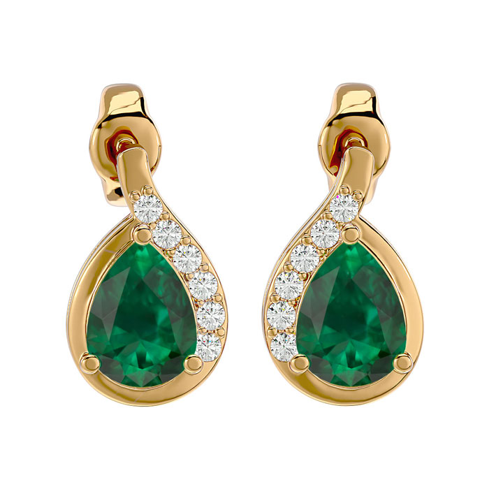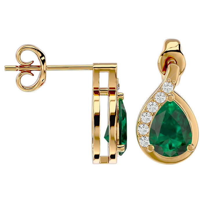 1.40 Carat Emerald and Diamond Pear Shape Stud Earrings In 14 Karat Yellow Gold
