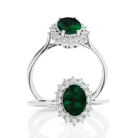 This elegant gemstone ring features one 8x6mm oval shape emerald gemstone at approximately 1.15 carats. It is surrounded by 16 sparkling diamonds in I-J color, I1-I2 clarity at 1/4 carat total weight. Total gem weight is approximately 1.40 carats. This ring is in 14 karat white gold.