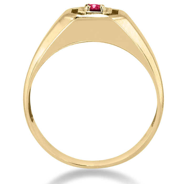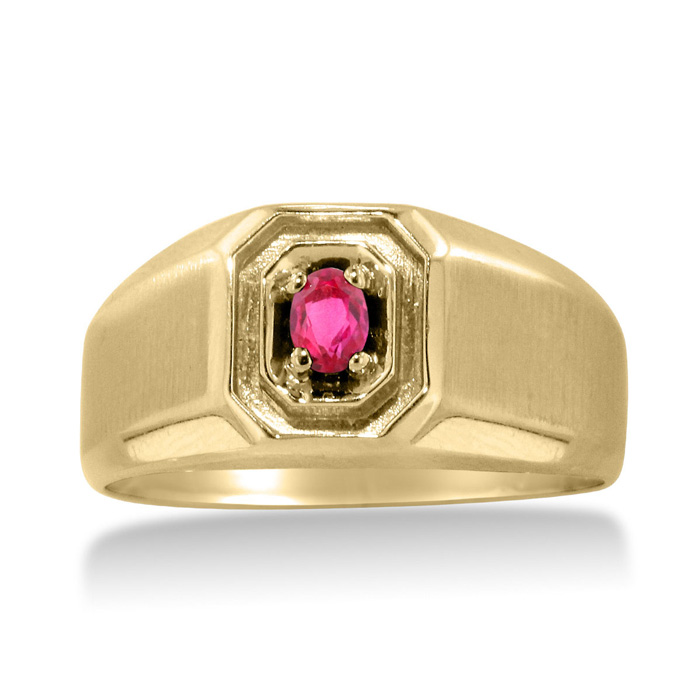 This 1/4 ct. oval cut, created ruby, set in solid yellow gold is quite the attention grabber! Ruby is the birthstone for the month of july, show that special man in your life that you care on his birthday with this special ring!!