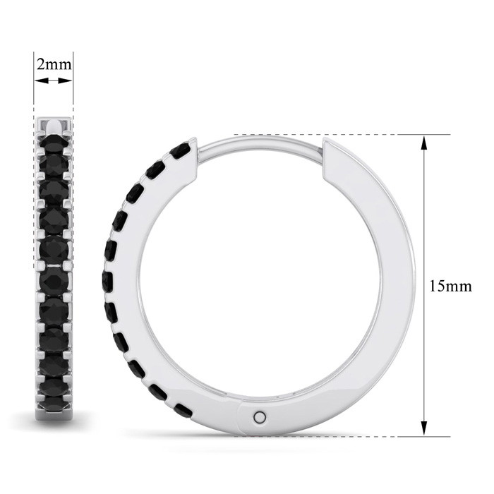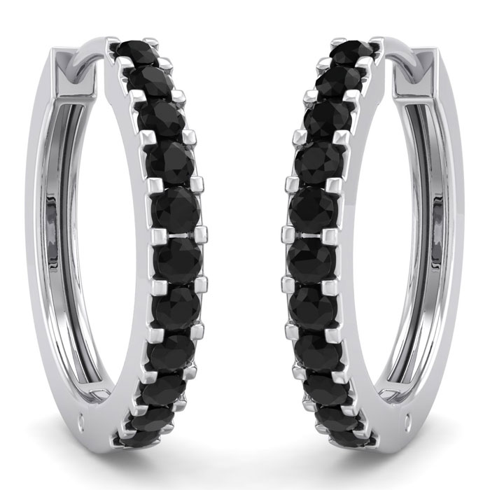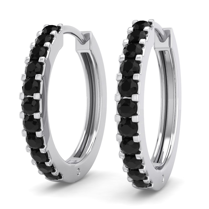 These elegant mens black diamond hoop earrings feature 22 black diamonds in I3 clarity totaling 1/5 carat. These earrings are in 14 karat white gold and have comfortable and secure hidden snap backs.