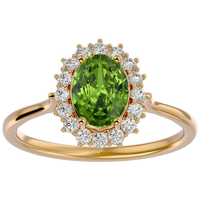 This elegant gemstone ring features one 8x6mm oval shape peridot gemstone at approximately 1.35 carats. It is surrounded by 16 sparkling diamonds in I-J color, I1-I2 clarity at 1/4 carat total weight. Total gem weight is approximately 1.60 carats. This ring is in 14 karat yellow gold.