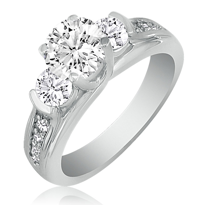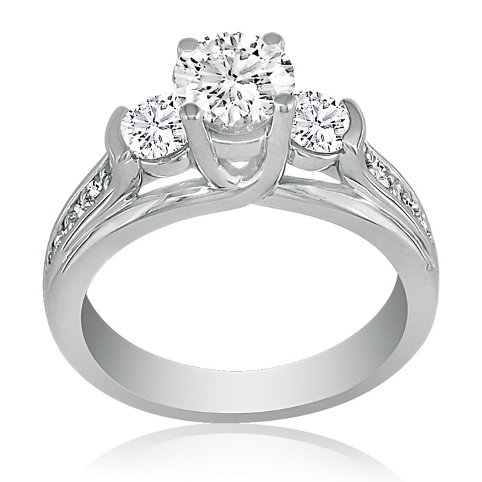 Take time to make the moment magical. When you ask for her hand, you will not go wrong with this exceptional three stone diamond engagement ring. Fashioned in 14K white gold, three shimmering round diamonds. The center stone is a big 1 ct. It is surrounded by two .25 ct round diamonds, and several more rounds line the band. This diamond is FOREVER!