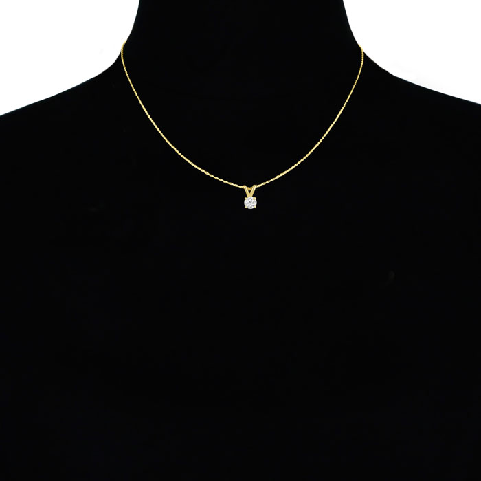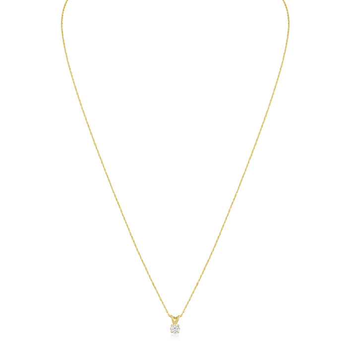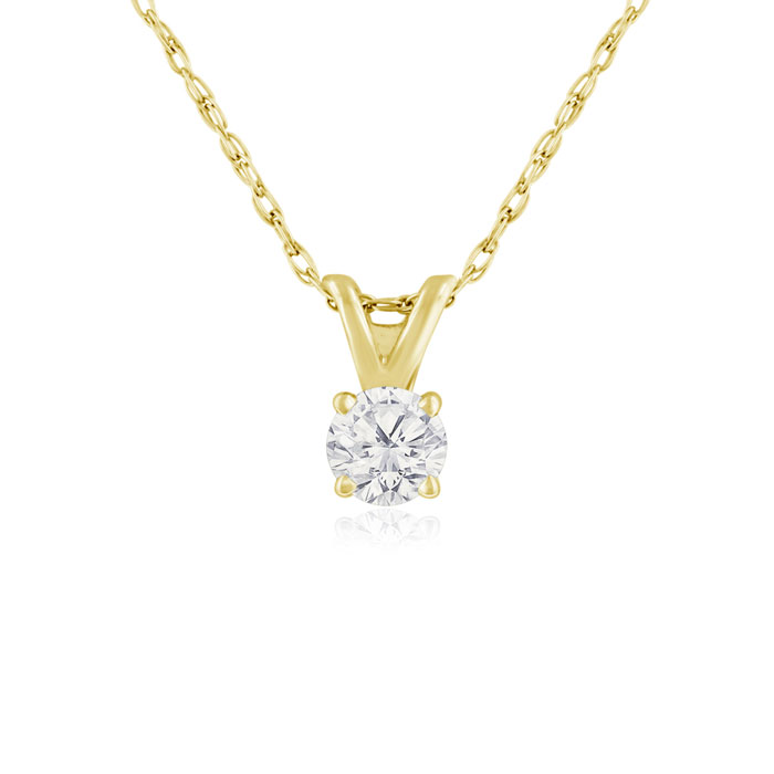 1/6ct Yellow Gold Round Diamond Solitaire Pendant in SuperJeweler's Finest Solitaire Pendant Quality. Our 4 Stars diamonds are G/H Color, SI1/SI2 Clarity, which are top fine white color, extremely brilliant because of our fine cut and totally eye clean. The mounting is a heavy, sturdy 14k gold basket setting, to ensure safe long term wearability. It even comes with a complementary 18-inch chain.