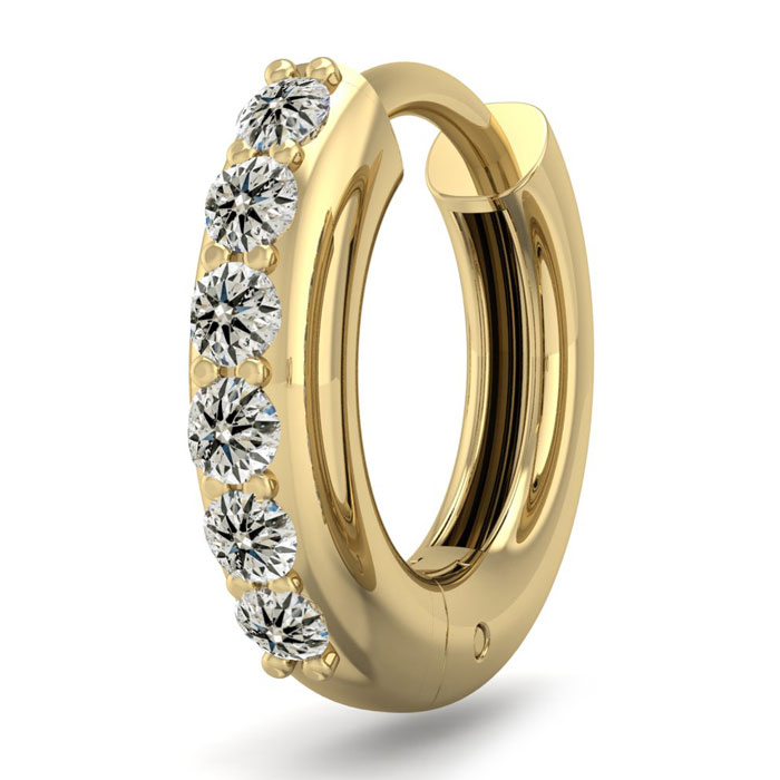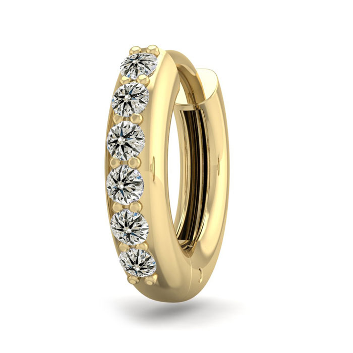 This elegant mens diamond hoop earring features 6 diamonds totaling 1/8 carat. Diamond color is K-L color, I2-I3 clarity. This earring is in 14 karat yellow gold and has comfortable and secure hidden snap backs.