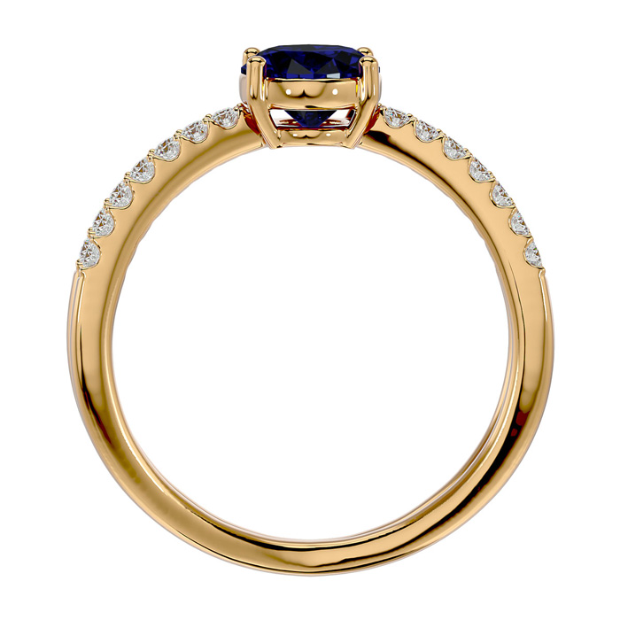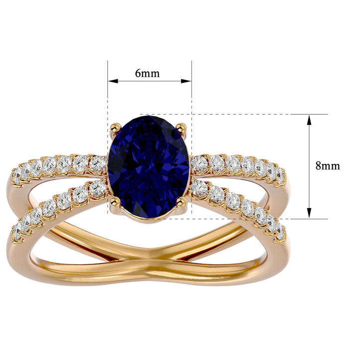 This elegant gemstone ring features one 8x6mm oval shape sapphire gemstone at approximately 1.60 carats. It is surrounded by 28 sparkling diamonds in I-J color, I1-I2 clarity at 1/4 carat total weight. Total gem weight is approximately 1.85 carats. This ring is in 14 karat yellow gold.