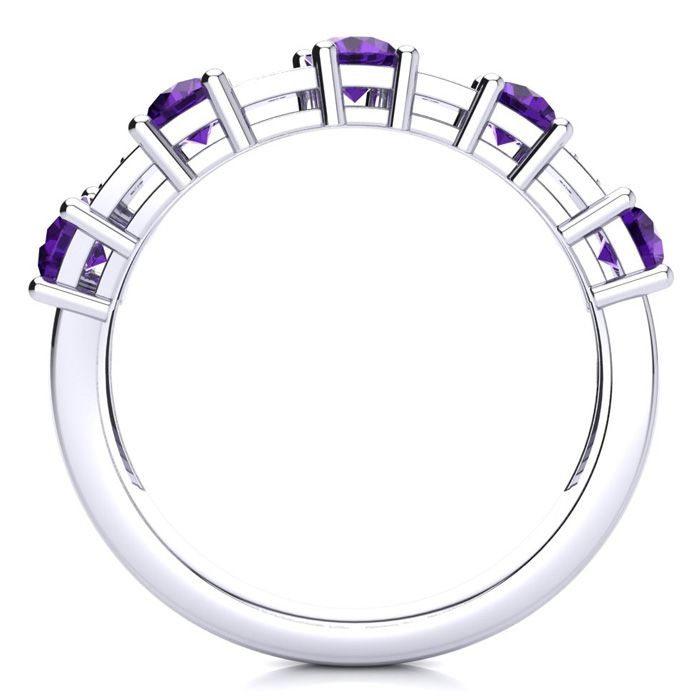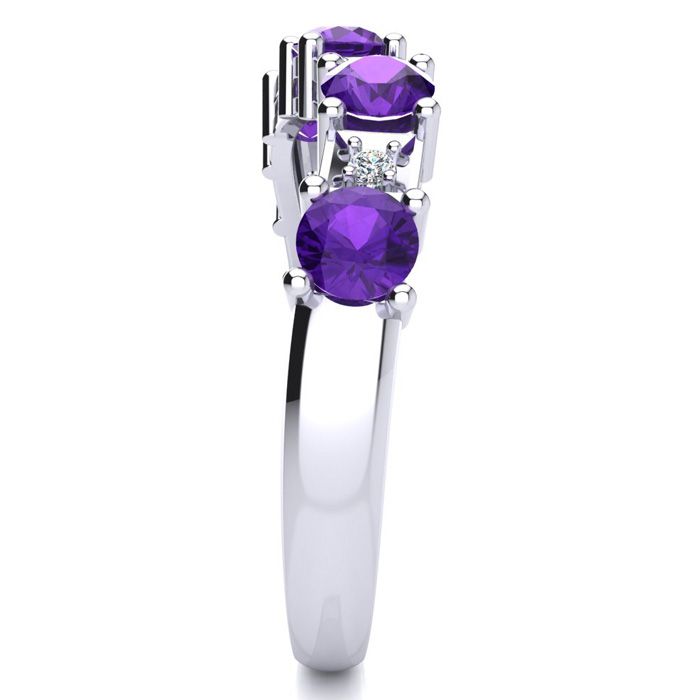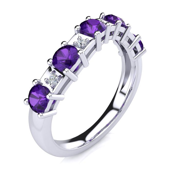 This classic journey ring features five round amethyst gemstones at 1.00 carats. There are 4 sparkling diamonds in I-J color, I1-I2 clarity at 0.04 carats. Total gem weight is 1.04 carats. This ring is crafted in 10 karat white gold.