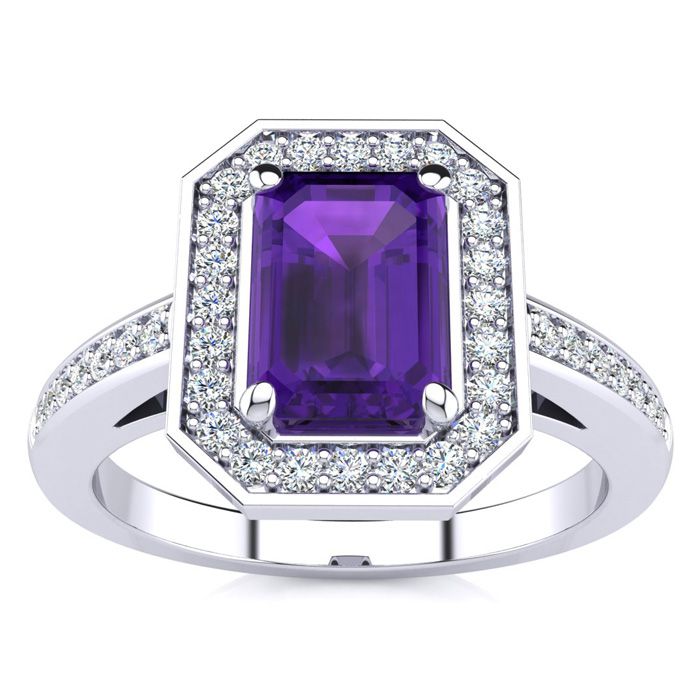 This stunning gemstone and halo diamond ring features one 7x5mm emerald shape amethyst gemstone at 0.90 carats. It is surrounded by 40 sparkling diamonds in a halo and down the band in I-J color, SI2-I1 clarity at 0.22 carats. Total gem weight is 1.11 carats. This ring is crafted in 14 karat white gold.