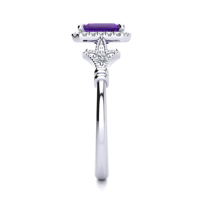 This stunning gemstone and halo diamond vintage ring features one 7x5mm emerald cut amethyst gemstone at 0.90 carats. It is surrounded by 22 sparkling diamonds in a halo and down the band in H-I color, I1-I2 clarity at 0.25 carats. Total gem weight is 1.15 carats. This ring is crafted in 14 karat white gold.