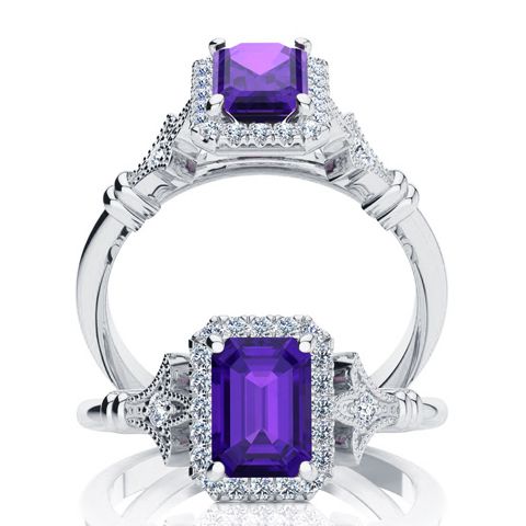 This stunning gemstone and halo diamond vintage ring features one 7x5mm emerald cut amethyst gemstone at 0.90 carats. It is surrounded by 22 sparkling diamonds in a halo and down the band in H-I color, I1-I2 clarity at 0.25 carats. Total gem weight is 1.15 carats. This ring is crafted in 14 karat white gold.