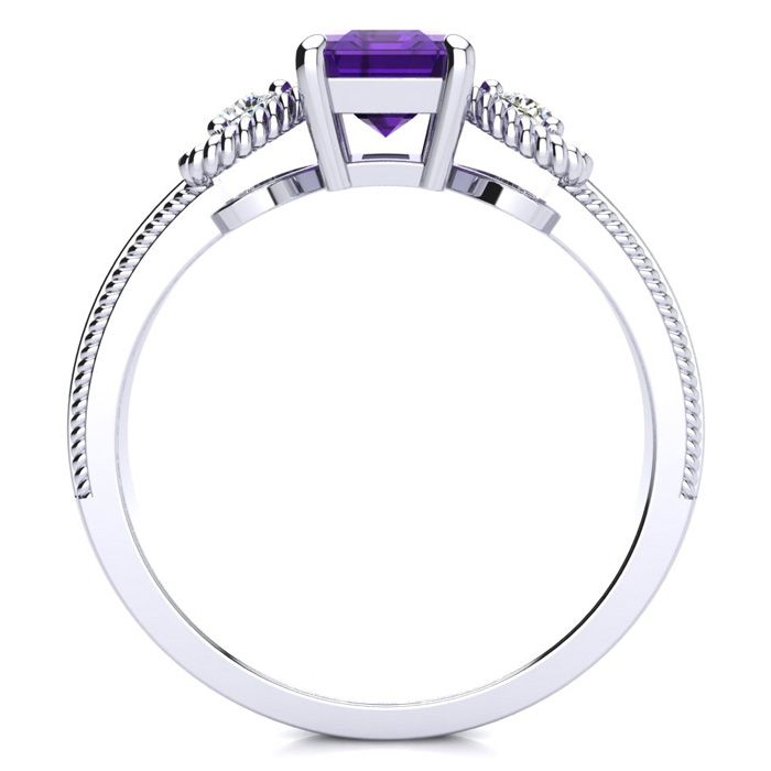 This stunning gemstone and diamond ring features one 7x5mm emerald cut amethyst gemstone at 0.90 carats. It is surrounded by 2 sparkling diamonds in a heart in I-J color, I1-I2 clarity at 0.12 carats. Total gem weight is 1.02 carats. This ring is crafted in 10 karat white gold.