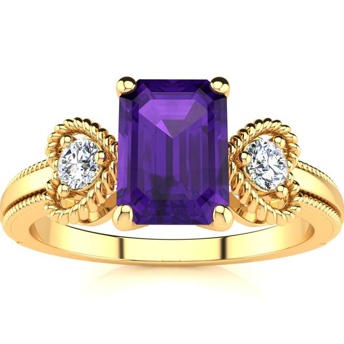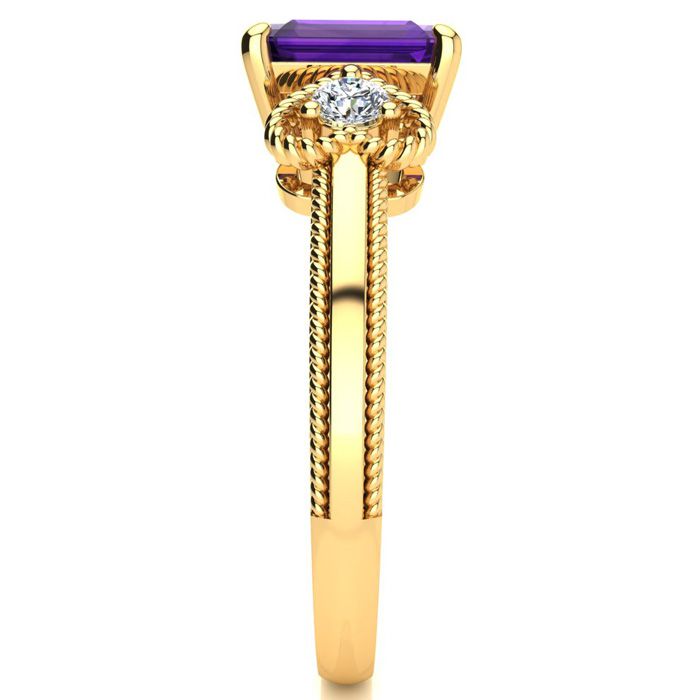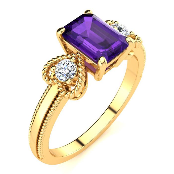 This stunning gemstone and diamond ring features one 7x5mm emerald cut amethyst gemstone at 0.90 carats. It is surrounded by 2 sparkling diamonds in a heart in I-J color, I1-I2 clarity at 0.12 carats. Total gem weight is 1.02 carats. This ring is crafted in 10 karat yellow gold.