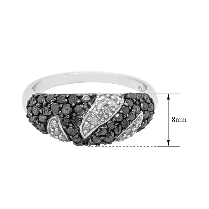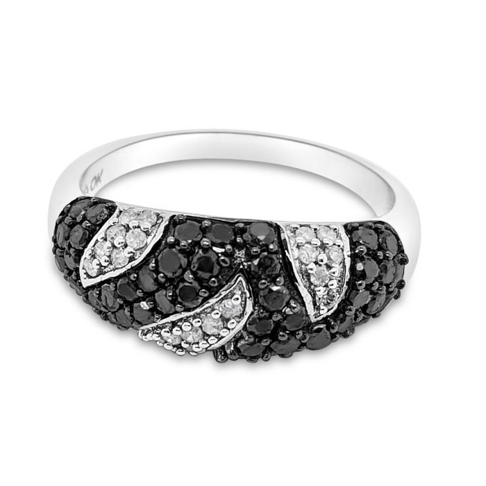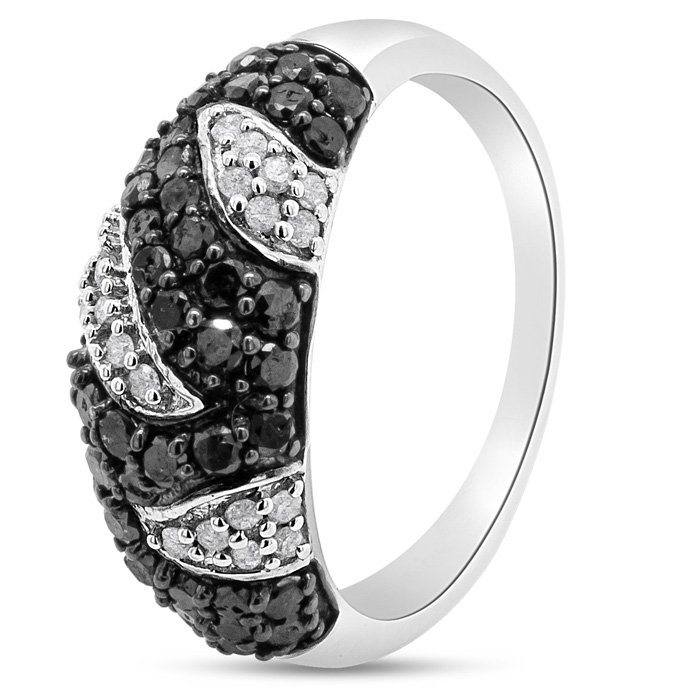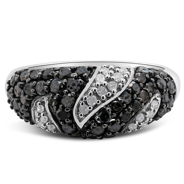 This fabulous black and white diamond ring features 21 natural rose cut white diamonds in I-J color, I3 clarity and 45 black diamonds in I3 clarity. Total carat weight is 1 carat. This ring is in sterling silver.