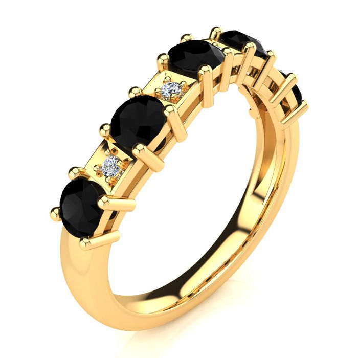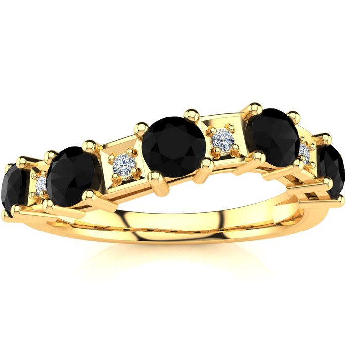 This classic journey ring features five round black diamonds at 1.00 carats. There are 4 sparkling white diamonds in I-J color, I1-I2 clarity at 0.04 carats. Total gem weight is 1.04 carats. This ring is crafted in 10 karat yellow gold.