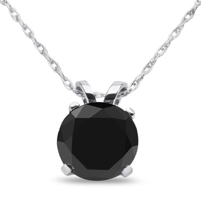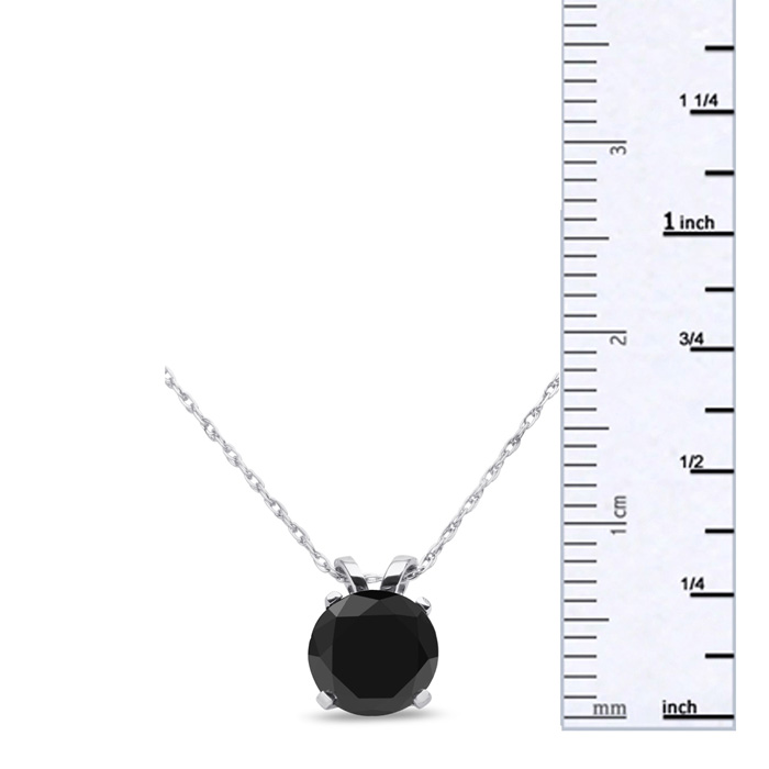This fabulous solitaire moissanite necklace features a sparkling 1 carat round shape center black moissanite in VVS1-VVS2 clarity. This necklace is in 14 karat white gold and comes with an 18 inch sterling silver cable chain with a spring-ring clasp.