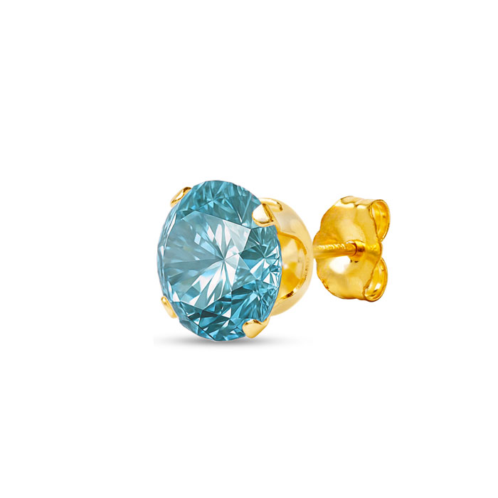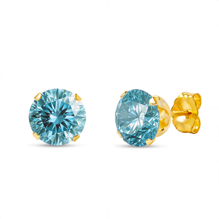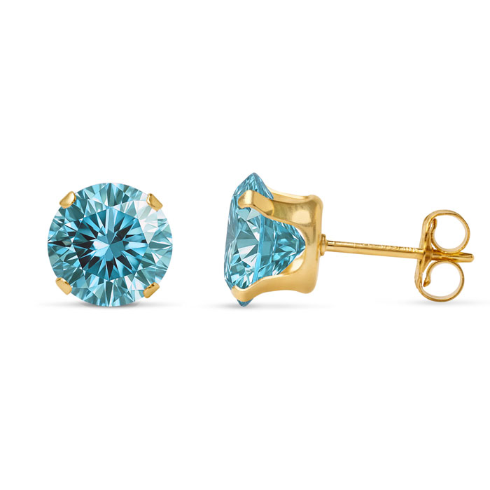 These moissanite earrings feature two 5mm blue moissanite gemstones, each weighing 1/2 carat. Moissanite clarity is VVS1-VVS2. Total carat weight is 1 carat. These earrings are in 14 karat yellow gold filled metal.