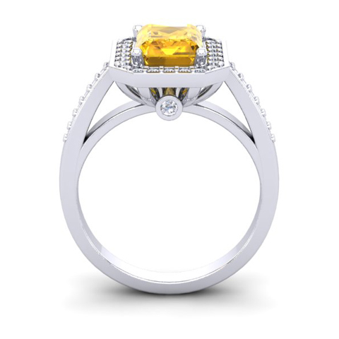 This stunning gemstone and halo diamond ring features one 7x5mm emerald shape citrine gemstone at 0.90 carats. It is surrounded by 40 sparkling diamonds in a halo and down the band in I-J color, SI2-I1 clarity at 0.22 carats. Total gem weight is 1.11 carats. This ring is crafted in 14 karat white gold.
