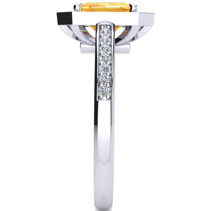 This stunning gemstone and halo diamond ring features one 7x5mm emerald shape citrine gemstone at 0.90 carats. It is surrounded by 40 sparkling diamonds in a halo and down the band in I-J color, SI2-I1 clarity at 0.22 carats. Total gem weight is 1.11 carats. This ring is crafted in 14 karat white gold.
