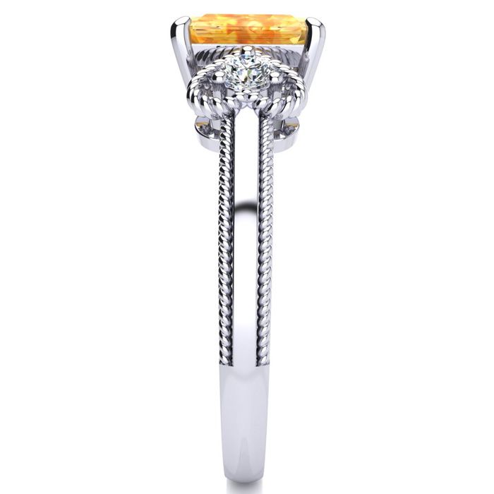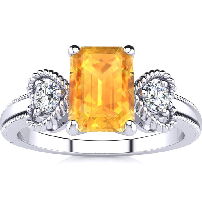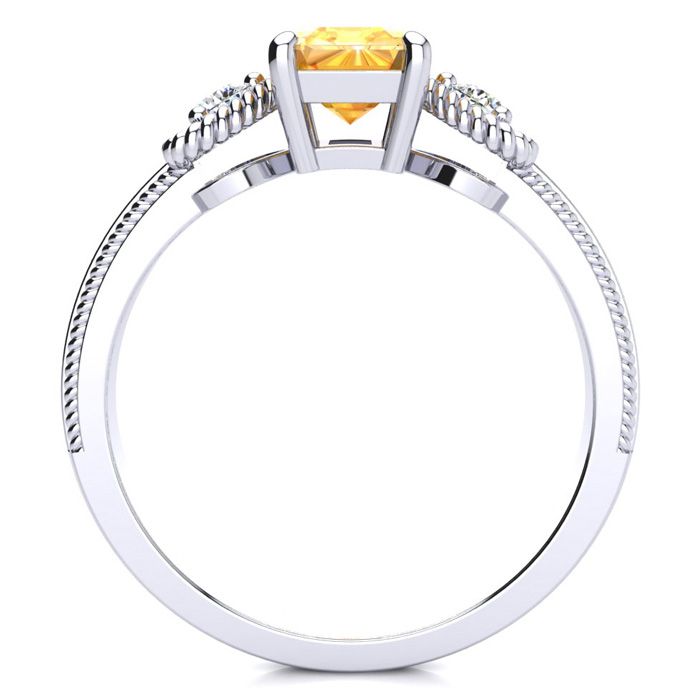 This stunning gemstone and diamond ring features one 7x5mm emerald cut citrine gemstone at 0.90 carats. It is surrounded by 2 sparkling diamonds in a heart in I-J color, I1-I2 clarity at 0.12 carats. Total gem weight is 1.02 carats. This ring is crafted in 10 karat white gold.