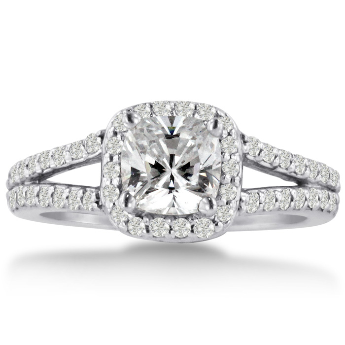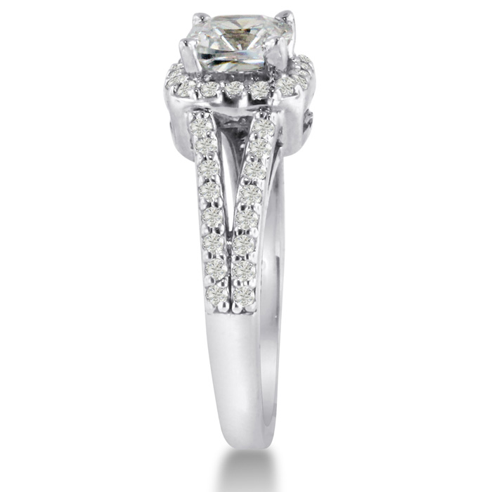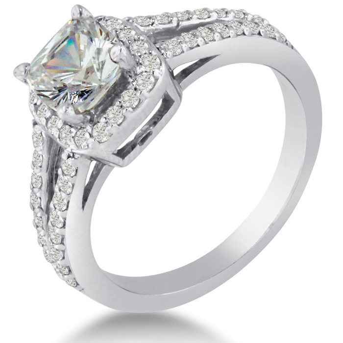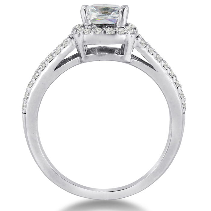 This ring is stunning I love the split shank style and the sparkly princess cut center stone, the rounded out square halo setting is very unique.