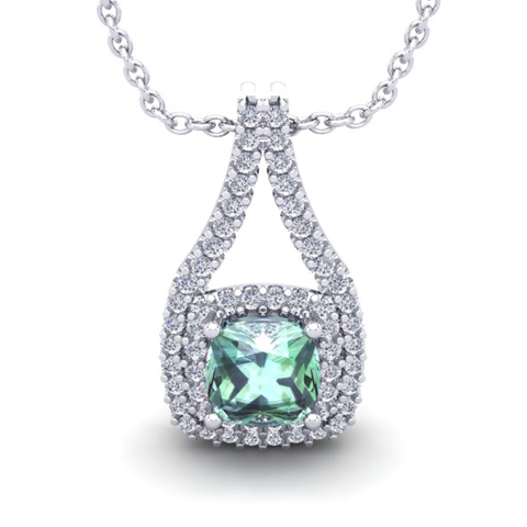 1 Carat Cushion Cut Green Amethyst and Double Halo Diamond Necklace In 14 Karat White Gold, 18 Inches