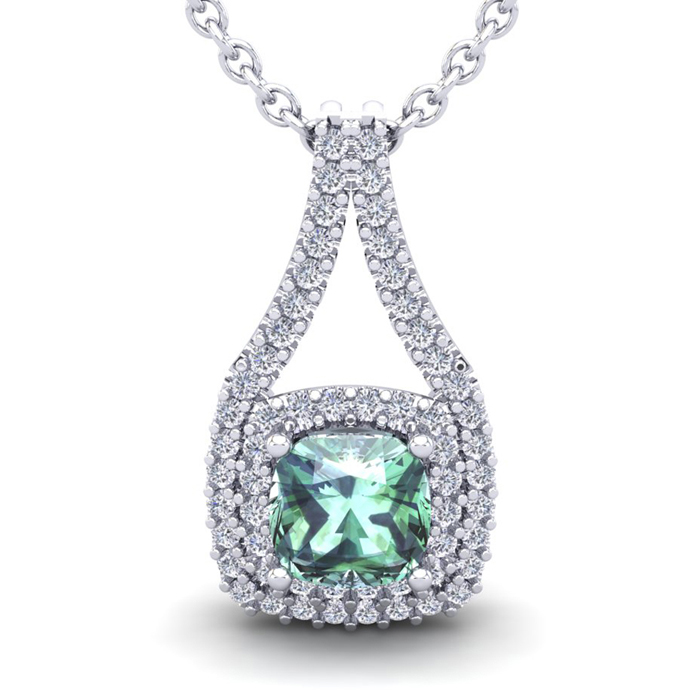 1 Carat Cushion Cut Green Amethyst and Double Halo Diamond Necklace In 14 Karat White Gold, 18 Inches