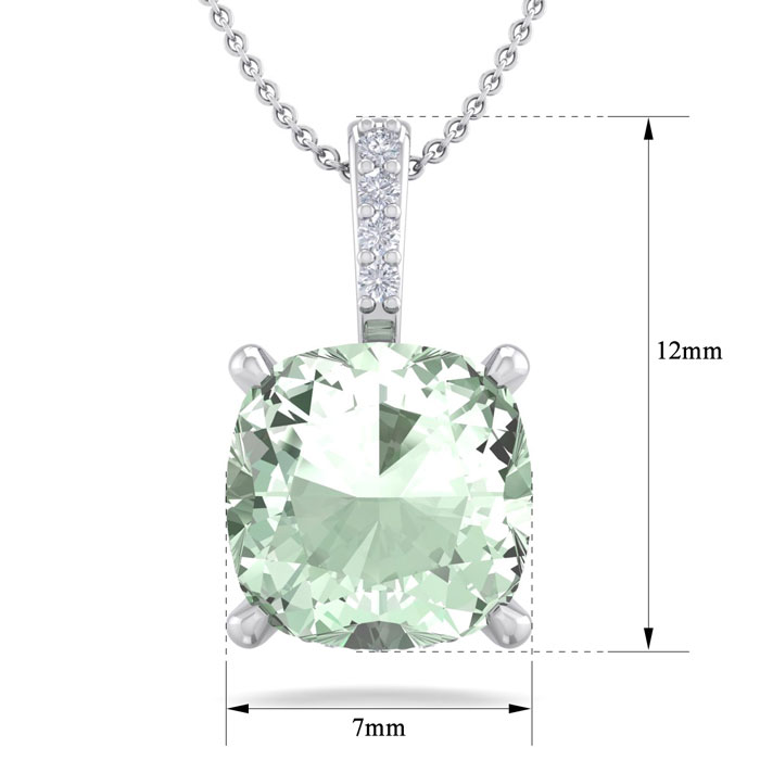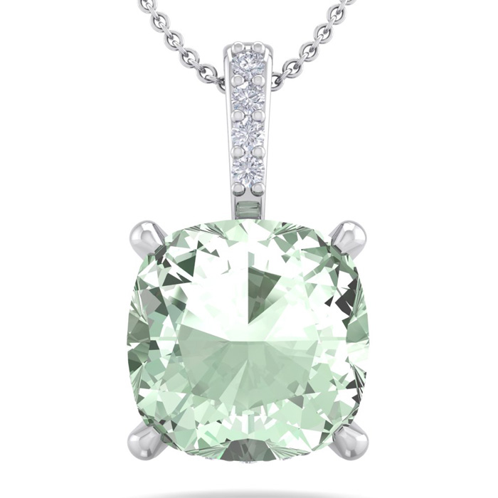 This elegant gemstone and diamond necklace features one 6mm cushion cut green amethyst gemstone at approximately 0.85 carats. It is accented with 15 sparkling diamonds in I-J color, I1-I2 clarity at 0.04 carats total. Total gem weight is approximately 0.89 carats. This necklace is in 14 karat white gold. This necklace comes with an 18 inch cable chain with a spring-ring clasp.