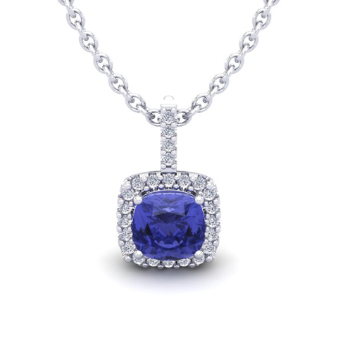 1 Carat Cushion Cut Tanzanite and Halo Diamond Necklace In 14 Karat White Gold, 18 Inches