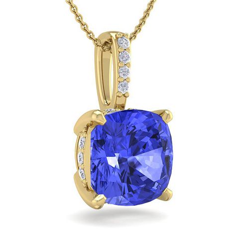 This elegant gemstone and diamond necklace features one 6mm cushion cut tanzanite gemstone at approximately 1 carat. It is accented with 15 sparkling diamonds in I-J color, I1-I2 clarity at 0.04 carats total. Total gem weight is approximately 1.04 carats. This necklace is in 14 karat yellow gold. This necklace comes with an 18 inch cable chain with a spring-ring clasp.
