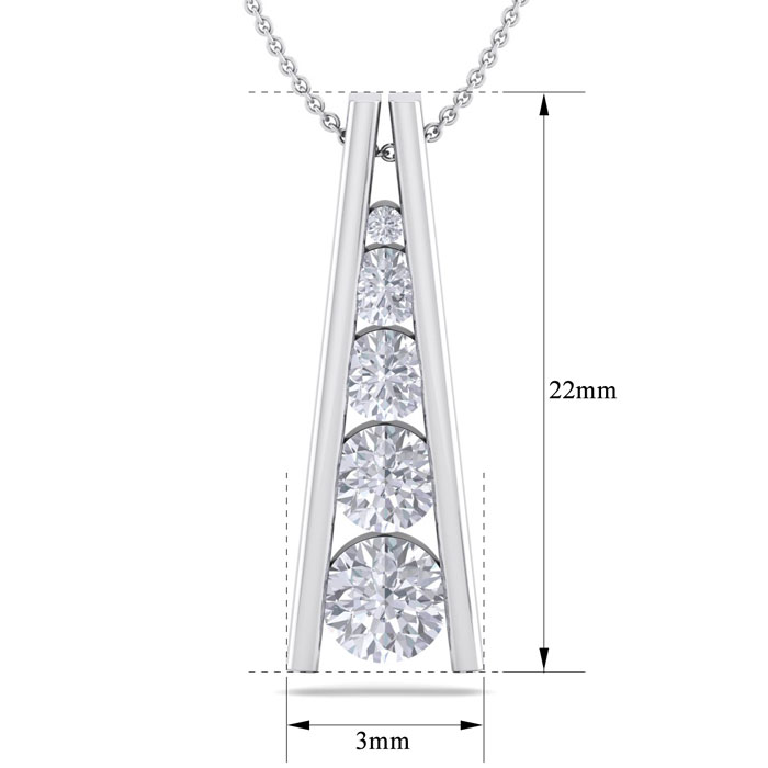 This elegant diamond necklace features 5 sparkling graduated diamonds in I-J color, I1-I2 clarity at 1 carat total weight. This necklace is in 14 karat white gold. This necklace comes with an 18 inch cable chain with a spring-ring clasp.