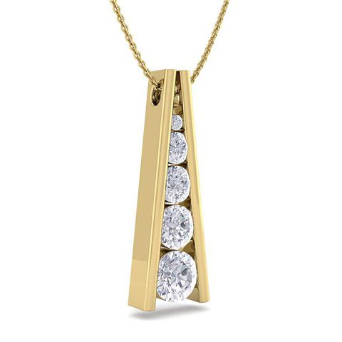 This elegant diamond necklace features 5 sparkling graduated diamonds in I-J color, I1-I2 clarity at 1 carat total weight. This necklace is in 14 karat yellow gold. This necklace comes with an 18 inch cable chain with a spring-ring clasp.