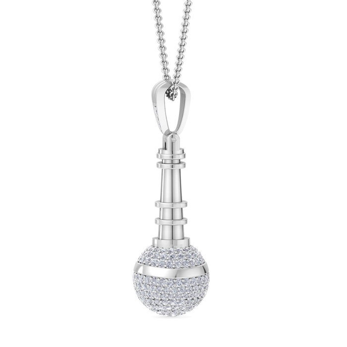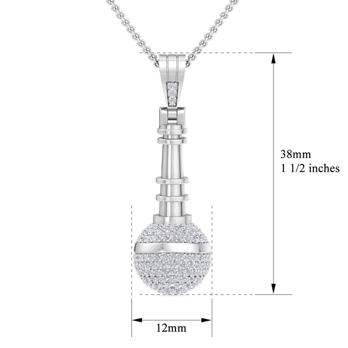 This necklace features 219 sparkling diamonds in H-I color, SI2-I1 clarity at 1 carat total weight. The microphone measures 1 1/2 inches long. This necklace is in 14 karat white gold and has an 18 inch cable chain with a spring-ring clasp.