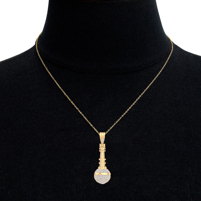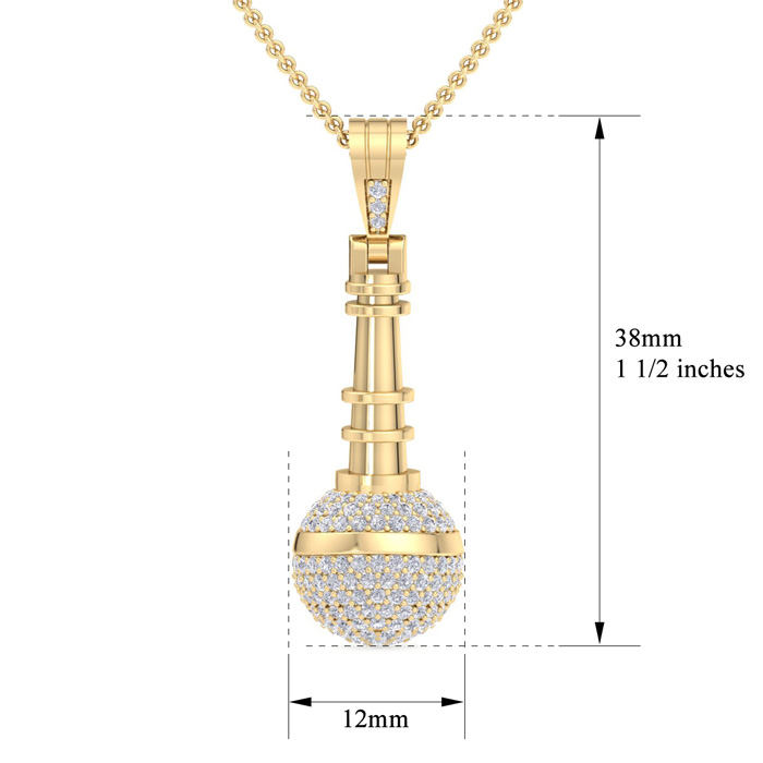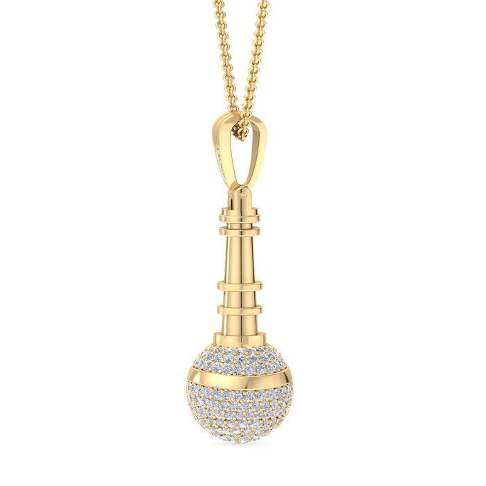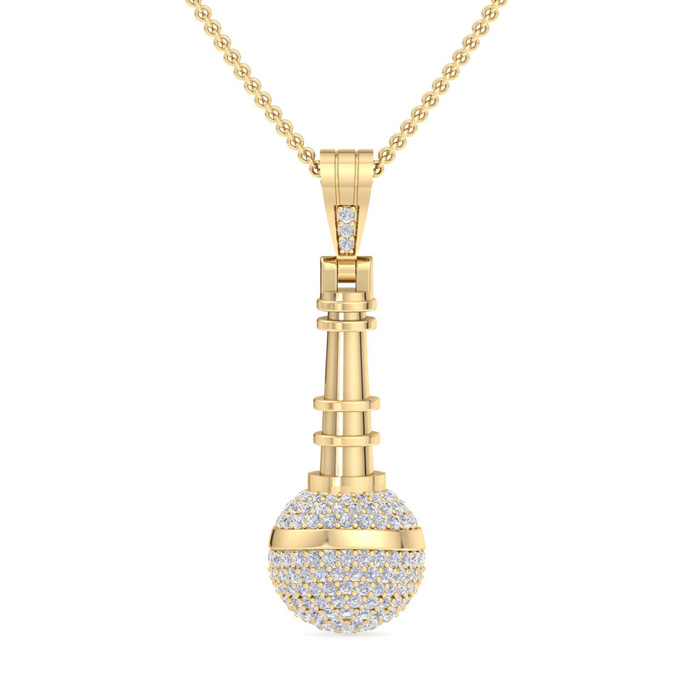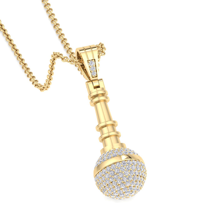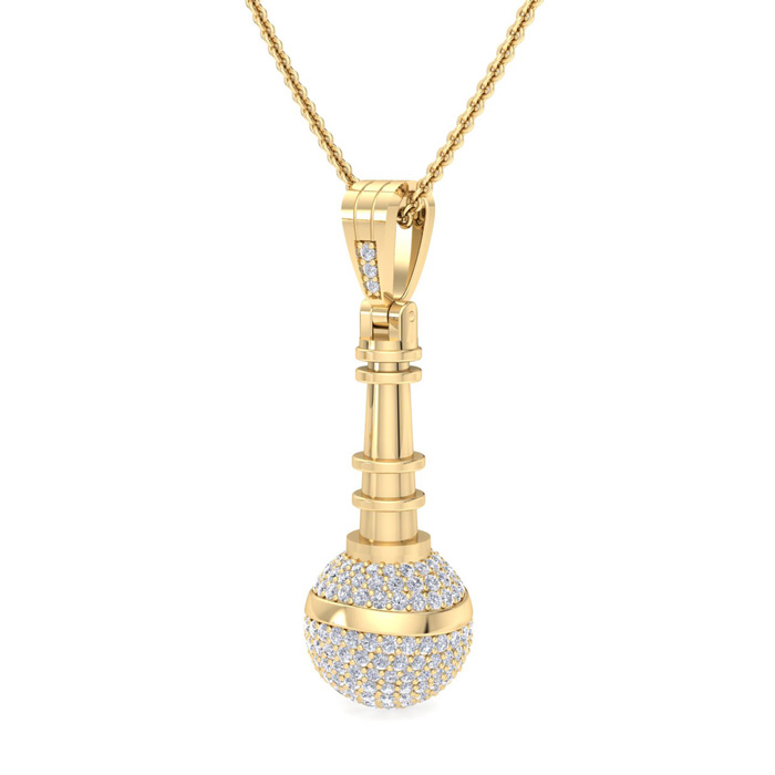 This necklace features 219 sparkling diamonds in H-I color, SI2-I1 clarity at 1 carat total weight. The microphone measures 1 1/2 inches long. This necklace is in 14 karat yellow gold and has an 18 inch cable chain with a spring-ring clasp.
