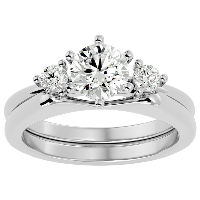 This fabulous diamond bridal set features a sparkling 1 carat clarity enhanced round shape center diamond in I-J color, I1-I2 clarity. It is surrounded by two side diamonds in the ring enhancer totaling 1/5 carat. Total carat weight is 1 1/5 carat. This ring is in 14 karat white gold.