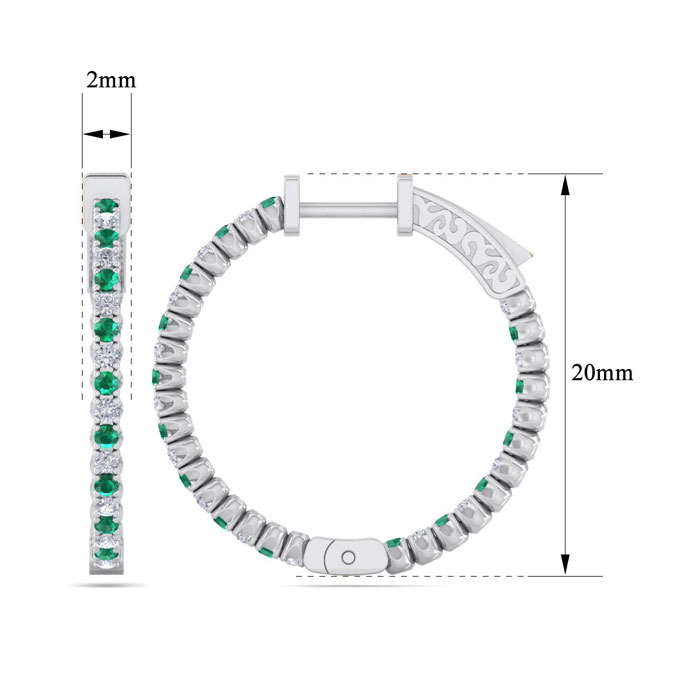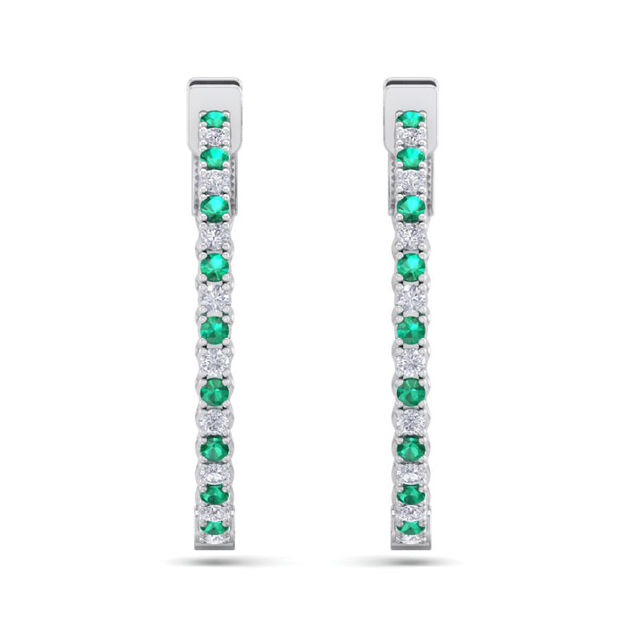 1 Carat Emerald and Diamond Hoop Earrings In 14 Karat White Gold, 3/4 Inch