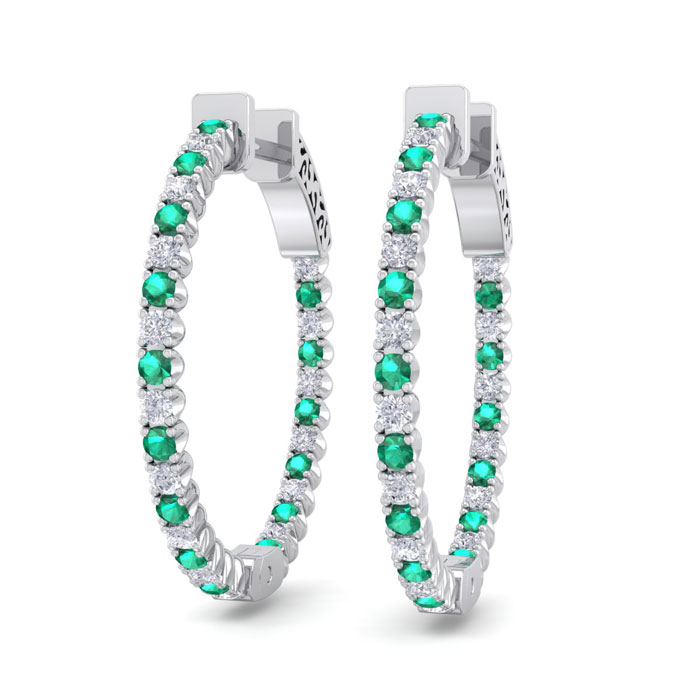 1 Carat Emerald and Diamond Hoop Earrings In 14 Karat White Gold, 3/4 Inch