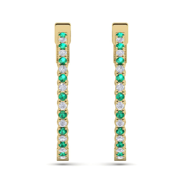 1 Carat Emerald and Diamond Hoop Earrings In 14 Karat Yellow Gold, 3/4 Inch