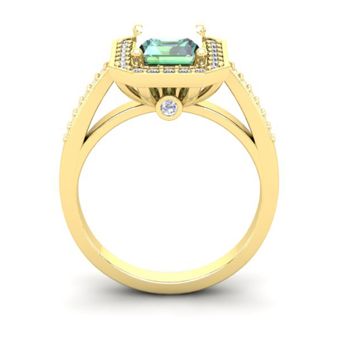 This stunning gemstone and halo diamond ring features one 7x5mm emerald shape green amethyst gemstone at 0.90 carats. It is surrounded by 40 sparkling diamonds in a halo and down the band in I-J color, SI2-I1 clarity at 0.22 carats. Total gem weight is 1.11 carats. This ring is crafted in 14 karat yellow gold.