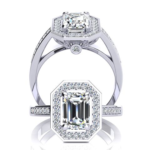 This halo diamond engagement ring stuns with a clarity enhanced emerald shape center diamond that measures approximately 6x4.5mm at 0.85 carats. There are 32 diamonds in a halo and along the band totaling at 0.21 carats. Total gem weight of the ring is approximately 1.06 carats in H-I color, SI1-SI2 clarity. This ring is in 14 karat white gold.