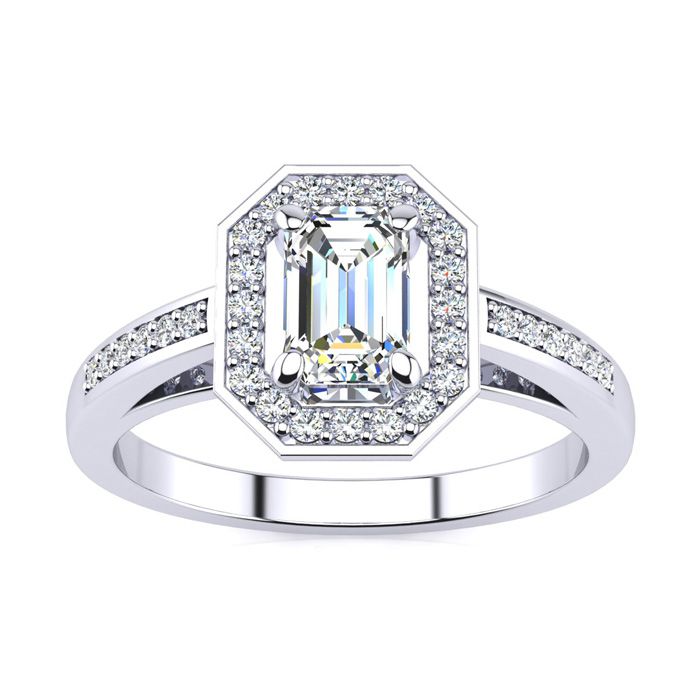 This halo diamond engagement ring stuns with a clarity enhanced emerald shape center diamond that measures approximately 6x4.5mm at 0.85 carats. There are 32 diamonds in a halo and along the band totaling at 0.21 carats. Total gem weight of the ring is approximately 1.06 carats in H-I color, SI1-SI2 clarity. This ring is in 14 karat white gold.