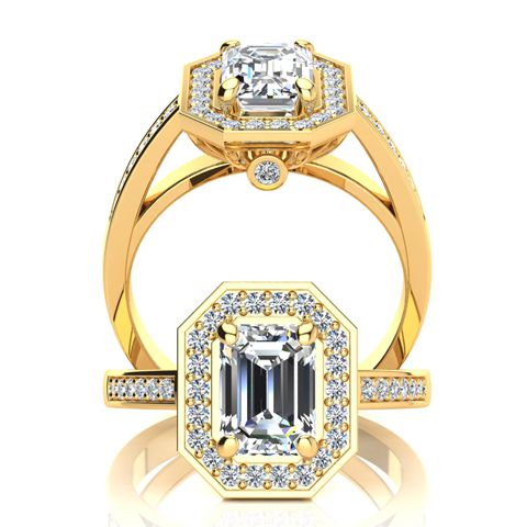 This halo diamond engagement ring stuns with a clarity enhanced emerald shape center diamond that measures approximately 6x4.5mm at 0.85 carats. There are 32 diamonds in a halo and along the band totaling at 0.21 carats. Total gem weight of the ring is approximately 1.06 carats in H-I color, SI1-SI2 clarity. This ring is in 14 karat yellow gold.