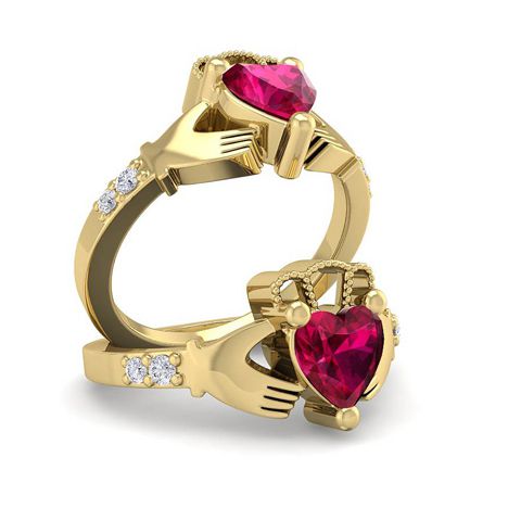 1 Carat Heart Shape Ruby and Diamond Claddagh Ring In 14 Karat Yellow Gold