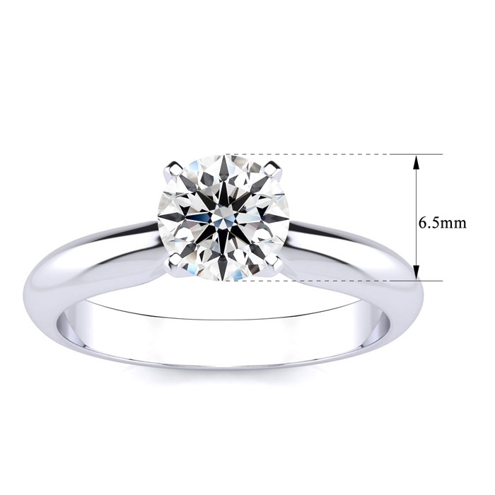 This lab grown diamond solitaire ring features one 6.5mm round lab grown diamond in G-H color, VS clarity. Total carat weight is 1 carat. This ring is in sterling silver.