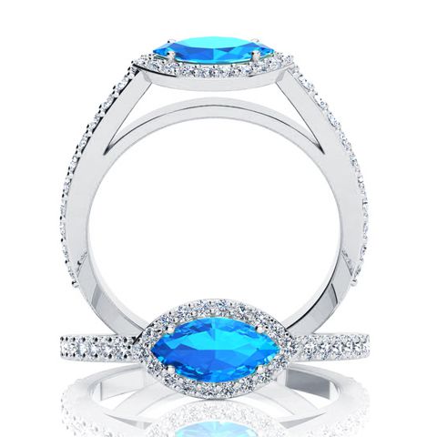 This stunning gemstone and halo diamond ring features one 8x4mm marquise shape blue topaz gemstone at 0.65 carats. It is surrounded by 38 sparkling diamonds in a halo and down the band in H-I color, I1-I2 clarity at 0.29 carats. Total gem weight is 0.94 carats. This ring is crafted in 14 karat white gold.