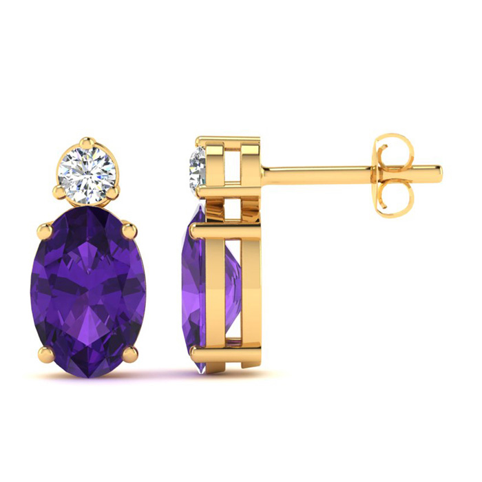These stunning gemstone and diamond earrings feature two 6x4mm oval shape amethyst gemstones at 0.86 carats. The gemstones are accented with two sparkling diamonds in a in I-J color, SI2-I1 clarity at 0.06 carats. Total gem weight is 0.92 carats. These earrings are crafted in 14 karat yellow gold and come with comfortable and secure post with friction backs.
