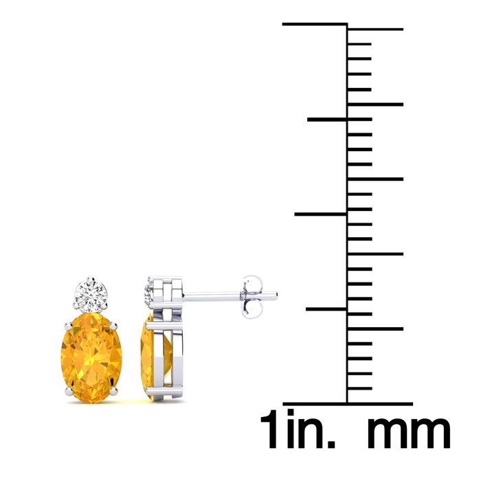 These stunning gemstone and diamond earrings feature two 6x4mm oval shape citrine gemstones at 0.86 carats. The gemstones are accented with two sparkling diamonds in a in I-J color, SI2-I1 clarity at 0.06 carats. Total gem weight is 0.92 carats. These earrings are crafted in 14 karat white gold and come with comfortable and secure post with friction backs.