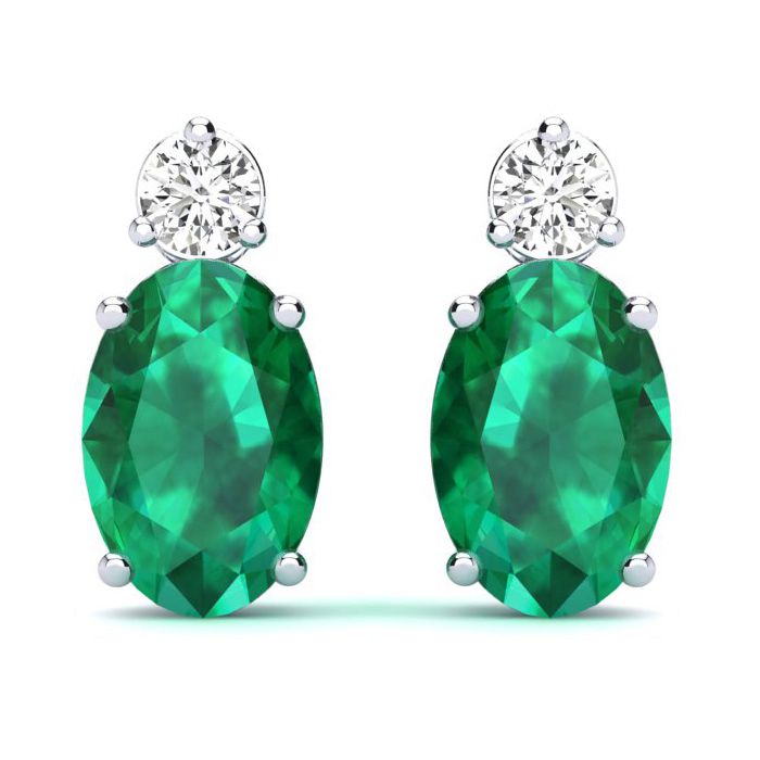 These stunning gemstone and diamond earrings feature two 6x4mm oval shape emerald gemstones at 0.90 carats. The gemstones are accented with two sparkling diamonds in a in I-J color, SI2-I1 clarity at 0.06 carats. Total gem weight is 0.96 carats. These earrings are crafted in 14 karat white gold and come with comfortable and secure post with friction backs.