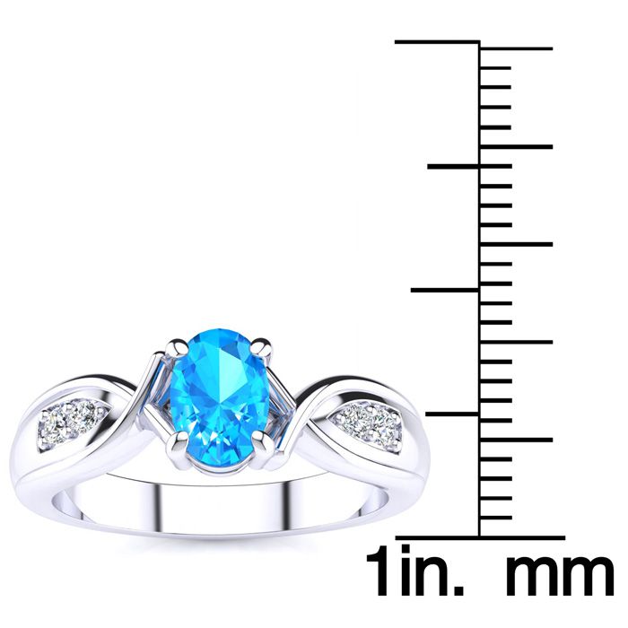 This stunning gemstone and diamond ring features one 7x5mm oval shape blue topaz gemstone at 1.00 carats. It is surrounded by 2 sparkling diamonds in I-J color, I1-I2 clarity at 0.04 carats. Total gem weight is 1 carat. This ring is crafted in 10 karat white gold.